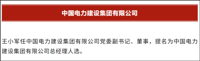 2022年5月,王小军任中国电建集团党委常委,2024年8月,任中国电建副总经理。
