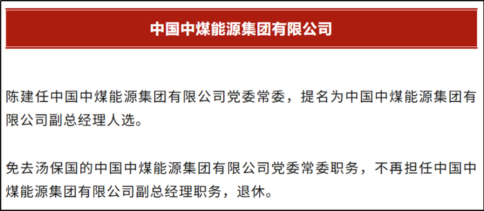 公开资料显示,2019年9月,汤保国担任中国中煤集团党委常委,并被提名为副总经理人选。2025年5月,又担任集团总法律顾问及首席合规官。