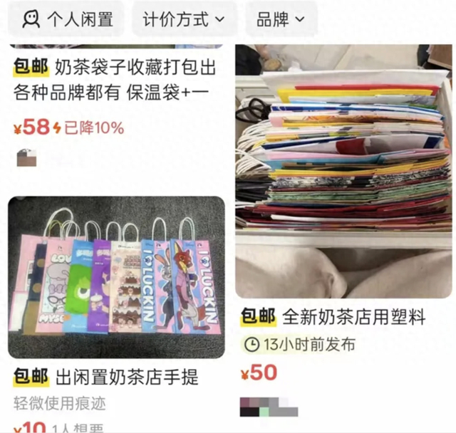 最近,在二手交易平台上,多个奶茶品牌的奶茶袋被二次出售,每个0.5至2元,有些联名款、限定款甚至要卖到15到50元。这些本属于免费的包装袋,竟然“身价逆袭”,制造出这样一种消费奇观,让人忍不住好奇:年轻人到底为什么沉迷囤奶茶袋?