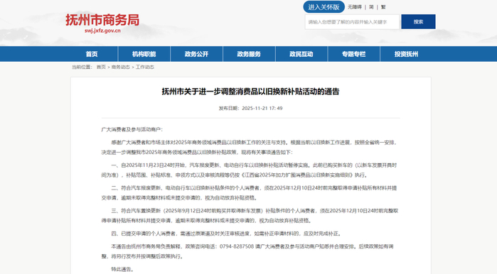 南昌市关于进一步调整消费品以旧换新补贴活动的通告