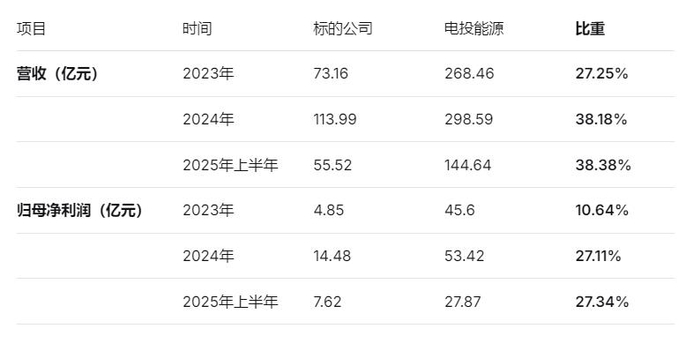 2025年上半年,电投能源营收、净利润分别为144.64亿元和27.87亿元;白音华煤为55.52亿元和7.62亿元,以此计算,标的公司的营收约占上市公司的38.38%,归母净利占比为27.34%