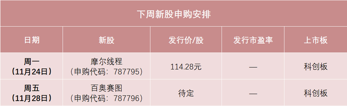 根据目前的发行安排,下周有2只新股申购,均为科创板新股。从日程安排看,下周一(11月24日)可申购摩尔线程,下周五(11月28日)可申购百奥赛图。摩尔线程是国产GPU龙头,上市后将成为“国产GPU第一股”。摩尔线程的发行价为114.28元/股,是今年以来发行价最高的新股,中一签需缴款57140元。摩尔线程的网上发行申购上限为11000股,顶格申购需配沪市市值11万元。
