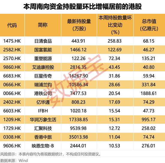 从持股量变化来看,本周13股获得南向资金持股量较上周增长超10%,日清食品居首,较上周增长258.83 %,其他还有国富氢能、重塑能源、艾迪康控股持股量增幅居前,分别为122.69%、72.34%、43.45%。