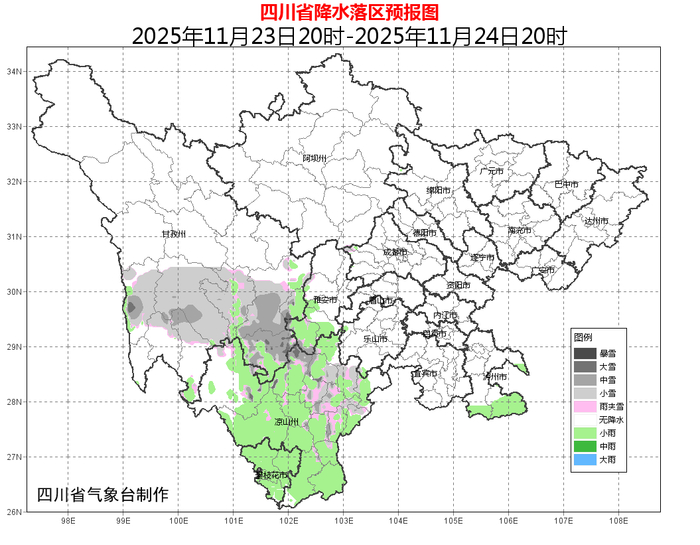 24日晚上到25日白天:雅安多云间阴有分散小雨,高海拔地区有雨夹雪或小雪,盆地其余地方多云间晴;甘孜州南部阴天间多云有阵雪(雨),局部中到大雪,川西高原其余地方晴间多云;攀西地区阴天间多云有分散阵雨,高海拔地区有雨夹雪或小雪,西北部局部地方有中到大雪。