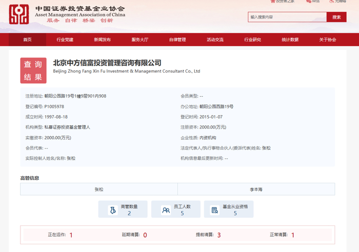 值得注意的是,中方信富还涉足私募业务。根据中国证券投资基金业协会的公示信息,该公司自2015年1月起登记为私募证券投资基金管理人。截至发稿,该登记信息状态仍为正常。