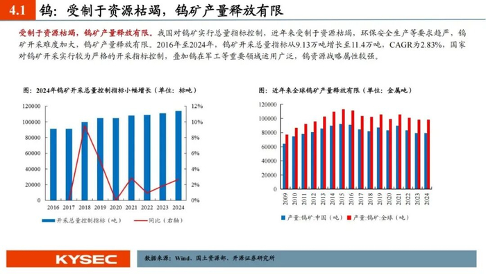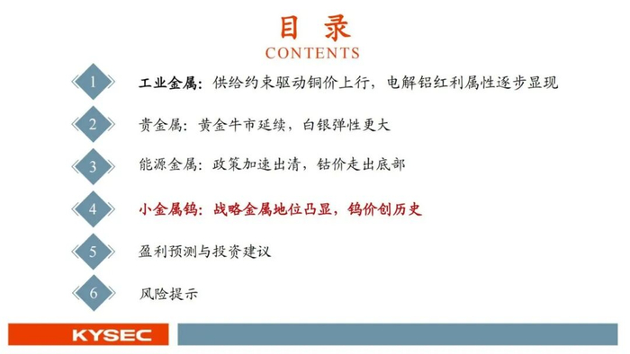 4、小金属钨:战略金属地位凸显,钨价创历史。钨作为我国优势战略金属,钨矿供应受制于资源枯竭,环保等因素制约,叠加国家对钨矿开采实施总量控制,钨矿产量释放有限。新兴增长领域拉动钨需求,供需持续偏紧,钨价重心有望继续向上。