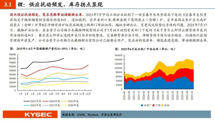 3、能源金属:政策加速出清。锂:碳酸锂价格历经深度调整,一度跌破部分高成本产能的成本线,使得全球部分高成本矿停产/减产,此外,国内“反内卷”政策对矿权审核的收紧,也一定程度上扰乱了供应的稳定性,约束了供应端无序扩张的预期,有望加速结束供应过剩的局面;需求端来看,新能源汽车市场虽然增速放缓,但仍保持增长态势,储能领域更是展现强劲动力,有望成为锂盐需求的第二增长极,远期来看,全固态电池等新技术的商业化应用有望进一步拉动碳酸锂需求。钴:刚果(金)战略矿产市场监管控制局9月21日宣布自10月15日起结束自今年2月以来实施的钴出口禁令,预计2026-2027年钴出口配额为9.66万吨,较2024年产量减少过半,国内钴原料短缺预期增强,钴价重心有望继续向。