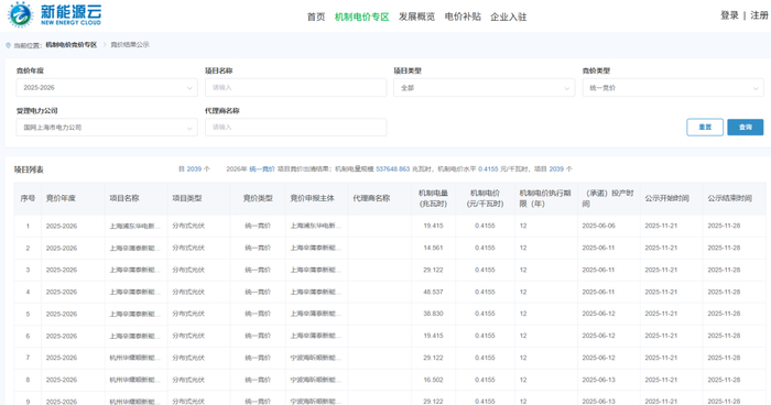 此次公示结果的上海2026年统一竞价项目机制电量规模537648.863兆瓦时,机制电价水平0.4155元/千瓦时,执行期限12年。