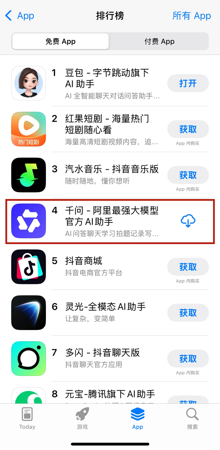 千问于11月17日正式开启公测,主要瞄准消费端市场。该应用基于阿里的开源模型Qwen3开发,免费向用户开放,直接与行业头部应用ChatGPT展开竞争。上线次日,千问APP便迅速攀升至苹果App Store免费应用总榜第四位,两天后又冲入该榜单前三甲。目前略有下降,已重新回到第四位。