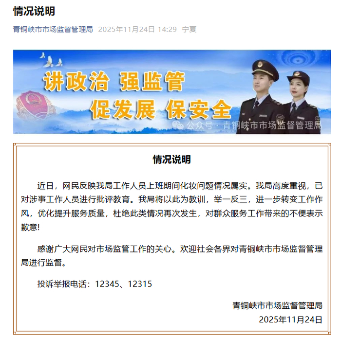 宁夏青铜峡市监局通报“工作人员上班时化妆”:属实,已批评教育