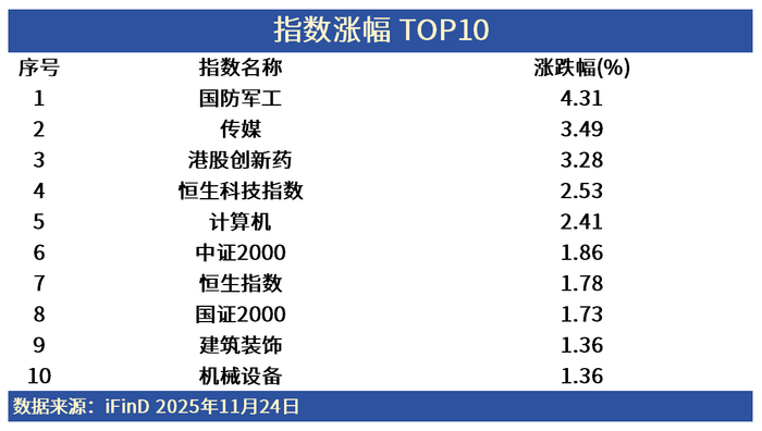 Wind数据显示,截至2025年11月24日A股收盘,国防军工、传媒、港股创新药领涨市场,涨幅分别为4.31%、3.49%、3.28%。