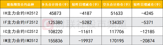 四大期指主力合约中,IH、IF、IC、IM合约多空双方均减仓,IM空头减仓数量较多。