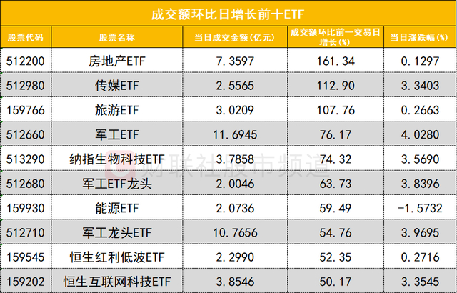 从成交额环比增长前十的ETF来看,房地产ETF(512200)成交额环比增长161%位居首位;传媒ETF(512980)成交额环比增长112%位居次席。