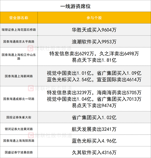 一线游资活跃度较高,AI应用概念股获实力游资大幅买卖。视觉中国遭两家一线游资席位(国泰海通证券成都北一环路、国泰海通证券上海新闸路)分别卖出1.04亿、1.01亿。