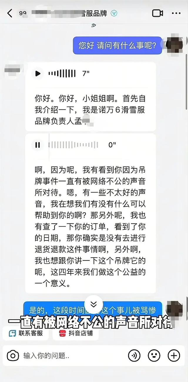 11月20日,邓女士发布被网友质疑“吊牌姐”的后续视频。邓女士称,滑雪服商家的官方品牌负责人孟女士联系她,希望帮她澄清吊牌事件。孟女士查询了订单,发现滑雪服于2023年购买,并不存在退款退货,因为该事件,滑雪服商家做了4年的公益活动被更多人看到。