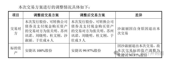 相较于今年8月披露的交易预案,本次发布的草案在交易细节上进行了小幅调整,但核心并购逻辑保持一致。公告显示,由于原定交易对方之一沙淑丽因自身原因退出交易,标的资产由安捷讯100%股份调整为99.97%股份,交易对方相应减少至5名,分别为张关明、苏州讯诺、刘晓明、杜文刚、于壮成。光库科技明确表示,此次调整未新增交易主体,减少的标的股份比例仅0.03%,远未达到20%的重大调整阈值,不会影响标的资产及业务的完整性,因此不构成对重组方案的实质性变更。