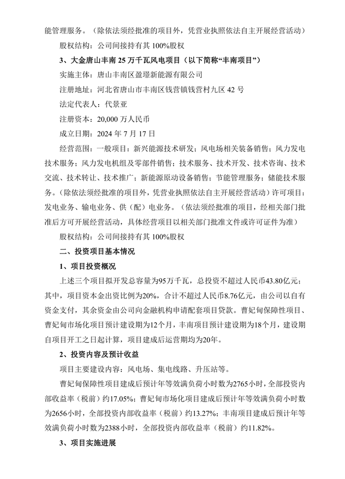 根据公告,为落实国家“双碳”战略,进一步扩大公司新能源投资开发规模,大金重工拟通过下属控股子公司投资建设大金重工曹妃甸区70万千瓦陆上风力发电项目(包含35万千瓦保障性项目和35万千瓦市场化两个子项目) 和大金唐山丰南25万千瓦风电项目。上述项目已被河北省发展和改革委员会列入2024年风电、光伏发电开发建设方案,并完成投资项目核准。