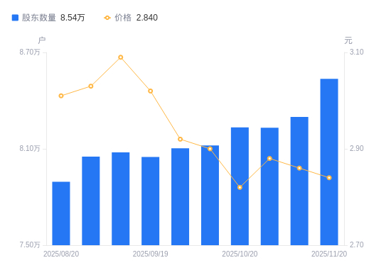 近一年(2024年11月20日至2025年11月20日),天邦食品A股股东户数从7.81万户,增加至8.54万户,增幅9.31%,区间股价下跌10.69%。