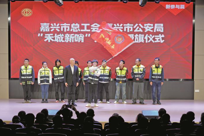 启动仪式上,10名“禾城新哨”义警队队员代表接过队旗,鲜红的旗帜在灯光下格外耀眼。这支队伍由快递员、网约车司机组成,它的成立不是简单的“添新岗”,而是嘉兴赋予新就业形态劳动者“城市主人翁”身份的又一实在举措。