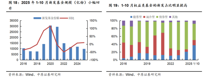 2025年1-10月新发基金规模同比回暖。根据Wind的数据进行统计,2025年1-10月新发基金份额(认购截止日)为9846.23亿份,同比+10.2%。其中,第三季度新发基金份额(认购截止日)为3661.70亿元,同比+89.4%,环比+32.2%,单季发行规模明显放量。2025年1-10月股票型、混合型、债券型新发基金规模占比分别为37.35%、13.14%、41.77%,较2024年全年分别+16.25pct、+7.24pct、-28.47pct,权益类基金的新发占比明显提高,固收类基金的新发占比则出现明显下降。