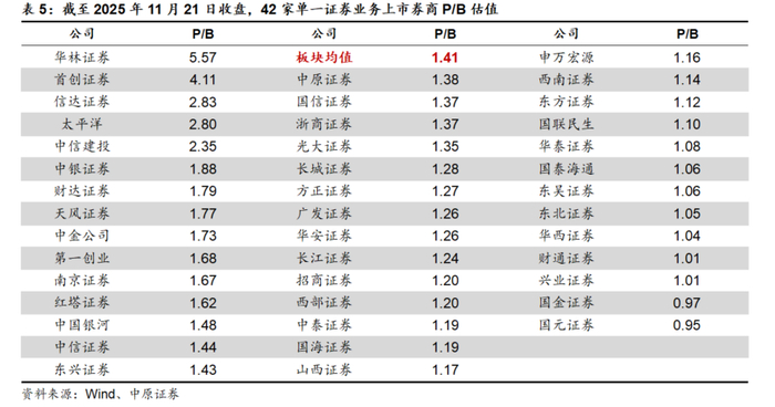 2025年上半年,券商指数处于中期修正的调整周期中,板块平均P/B震荡回落,并于4月7日创出1.278倍的年底低点,整体波动持续处于2016年以来1.54倍的板块平均估值之下。6月后,券商指数进入持续时间约两个月的震荡上涨周期,板块平均P/B震荡回升,并于8月25日创出1.688倍的年底高点,一度明显拉开了与近十年来板块平均估值之间的距离。9月以来,券商指数逐步转弱,板块平均P/B再度进入下行趋势,截至11月21日,券商板块平均P/B为1.414倍。2025年以来券商板块平均P/B的波动区间主要集中在1.35倍-1.60倍之间,围绕近十年来的板块平均估值波动,但大部分时间在1.54倍的平均估值之下运行。