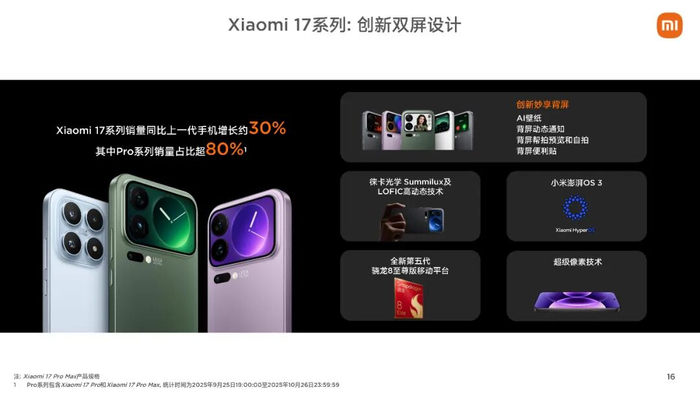 Xiaomi 17系列销量同比上一代手机增长约30%,其中Pro系列销量占比超80%(换而言之,Xiaomi 17标准版确实很菜)。