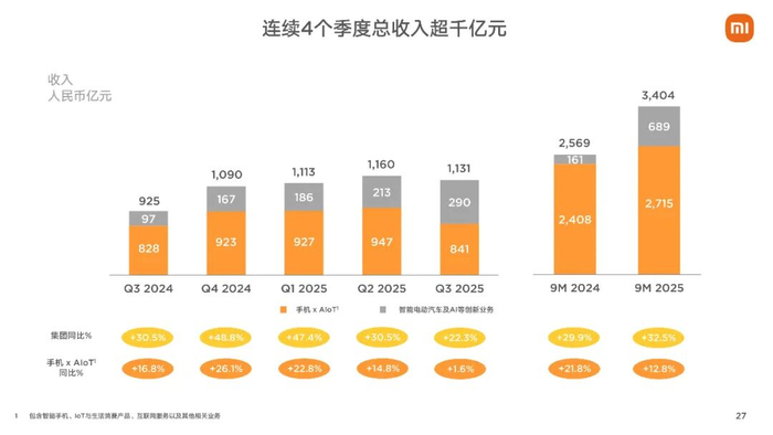 倘若只看原本的“手机 x AIoT”业务,不含汽车,那2024Q3到2025Q3的季度收入同比分别是+16.8%、+26.1%、+22.8%、+14.8%和+1.6%,本季度显著放缓。