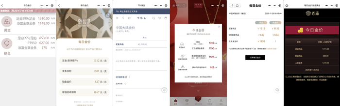具体而言,当日,老庙黄金上海区域足金饰品、周生生境内足金首饰价格为1315元/克,周大福足金(饰品、工艺品类)、谢瑞麟足金饰品、潮宏基足金(首饰摆件)境内价格为1312元/克,六福珠宝足金999/足金境内价格为1310元/克。