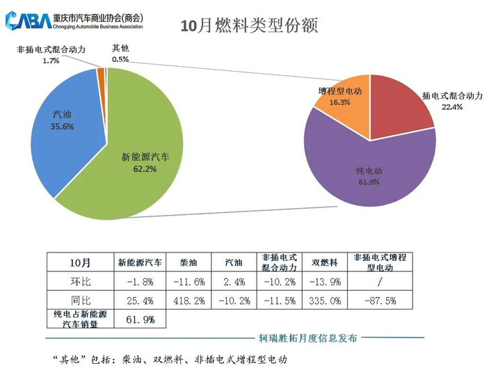 从10月销售车型的燃料类型来看,燃油车销量占比为35.6%,新能源汽车销量占比达到62.2%。10月份,新能源汽车销量同比增长25.4%,其中纯电车型占比新能源销量达61.9%,相比9月份略有回落。