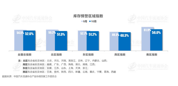 数据显示,10月中国汽车经销商库存预警指数为52.6%,同比上升2.1个百分点,环比下降1.9个百分点。库存预警指数位于荣枯线之上,汽车流通行业景气度有所改善。