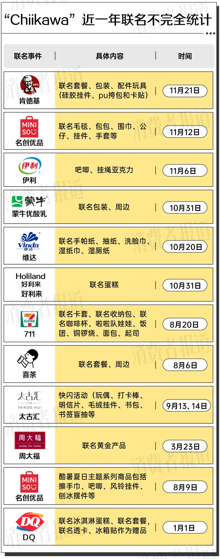 联名狂潮开始兴起,据记者不完全统计,今年以来,Chiikawa与包括肯德基在内至少联名11次。