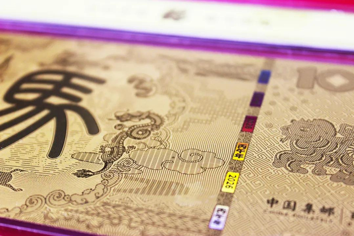 中间有一条光变油墨防伪安全线,角度一转,“丙午年”字样幻彩流转,官方级防伪。