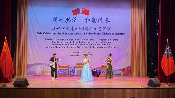 11月21日晚,“同心共济 和韵流长”庆祝中萨建交50周年文艺汇演在萨文化艺术中心举行。本次汇演由萨摩亚政府、中国驻萨大使馆、惠州市政府联合举办。