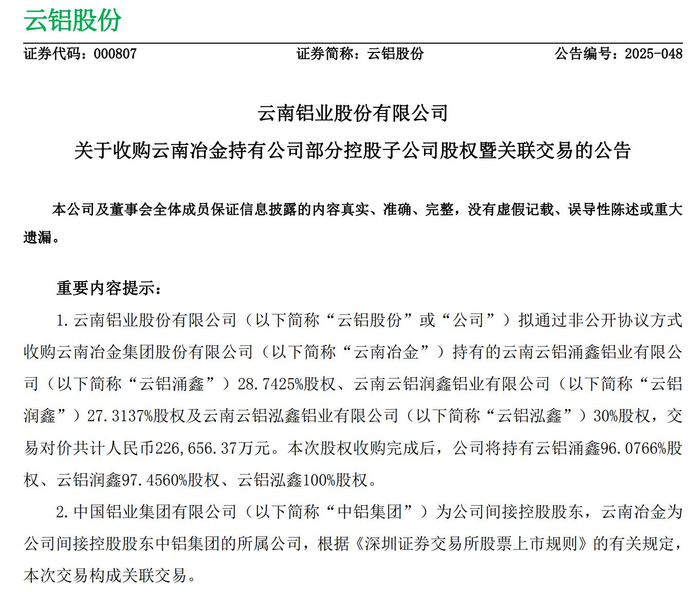每经记者注意到,由于交易对手云南冶金与云铝股份同受中国铝业集团有限公司(中铝集团)控制,且云南冶金还是云铝股份控股股东中国铝业的关联方,本次收购构成了关联交易。