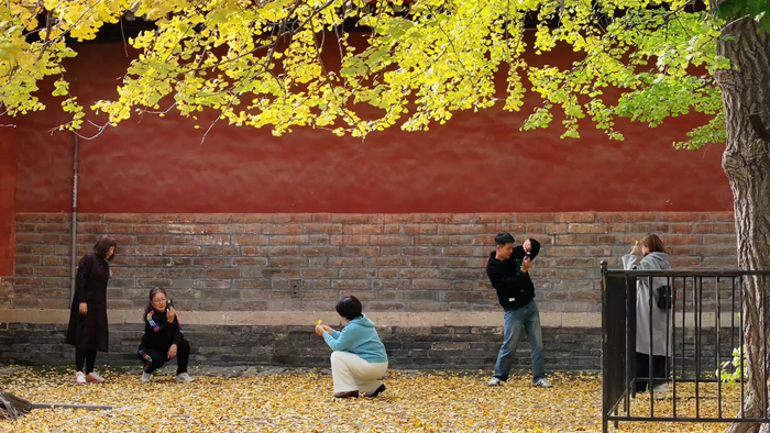 初冬时节,山东济宁曲阜孔庙旁的半壁街铺满金色银杏叶,慕名而来的游客络绎不绝。