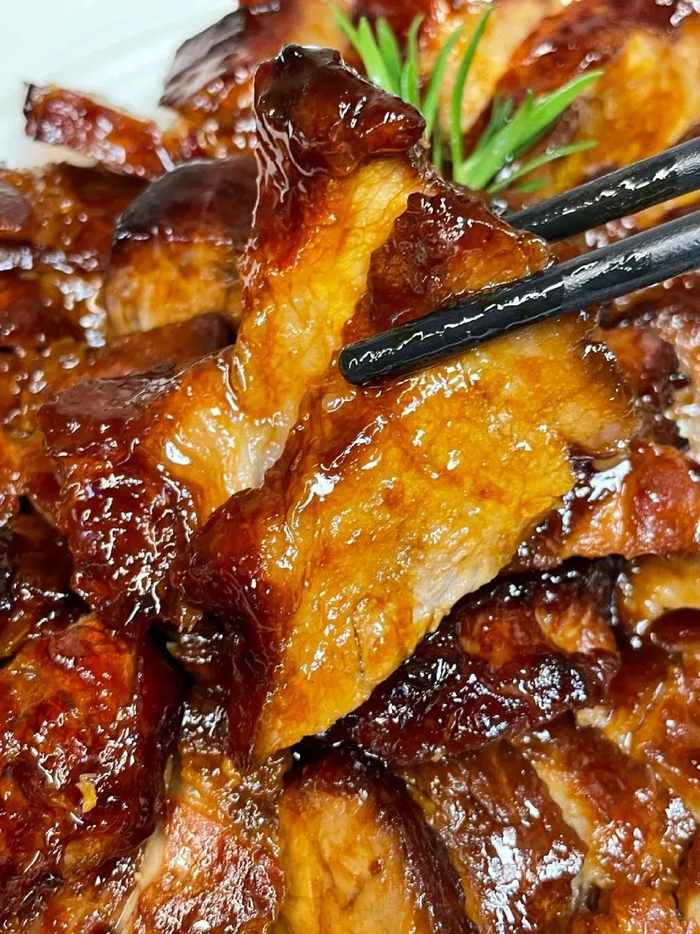🥩 淋酱:蜜汁从头淋下,均匀的包裹住叉烧,利用余温或短时间的高温烘烤,使蜜汁紧紧包裹住叉烧表面,形成一层晶莹剔透、焦香诱人的琥珀色外壳。
