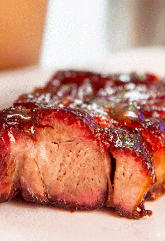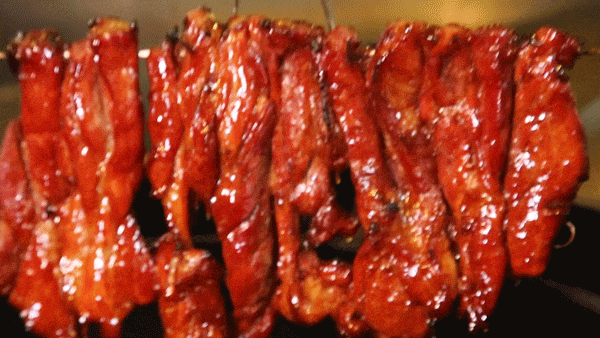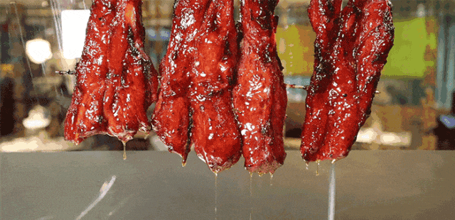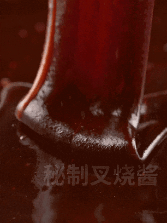 🥩 淋酱:蜜汁从头淋下,均匀的包裹住叉烧,利用余温或短时间的高温烘烤,使蜜汁紧紧包裹住叉烧表面,形成一层晶莹剔透、焦香诱人的琥珀色外壳。