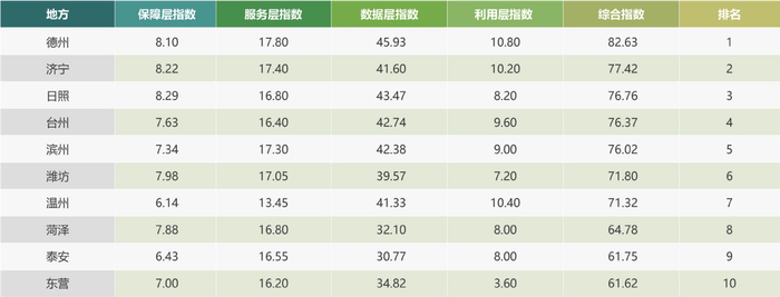 在四个单项维度上,浙江在保障层、数据层表现最优,山东在服务层、利用层表现最优。