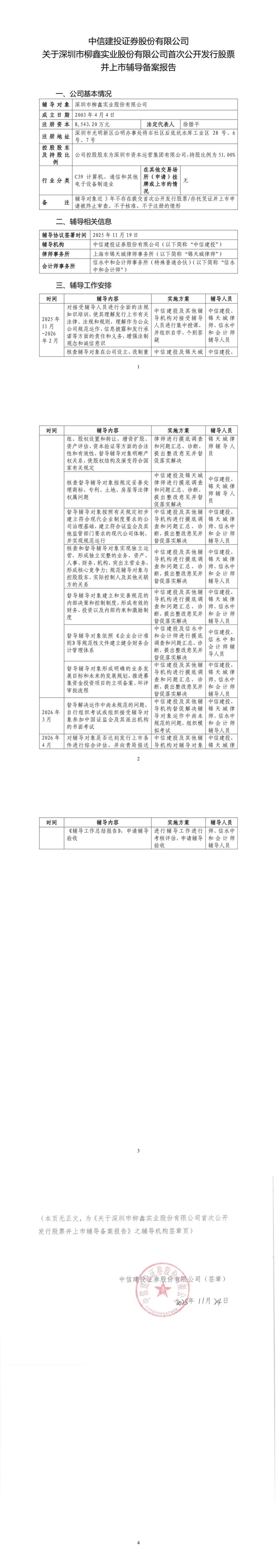 2025年11月26日,证监会官网显示,中信建投已提交《关于深圳市柳鑫实业股份有限公司首次公开发行股票并上市辅导备案报告》,落款日期为11月24日。目前,柳鑫股份的辅导状态为“辅导备案”。辅导机构为中信建投证券股份有限公司,律师事务所为上海市锦天城律师事务所,会计师事务所为信永中和会计师事务所(特殊普通合伙)。
