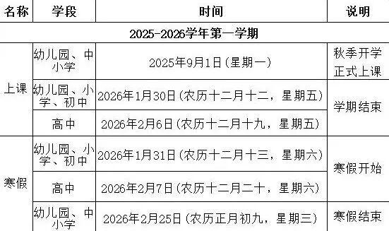 第一学期:2025年9月1日(农历七月初十,星期一)秋季开学,正式上课,2026年2月6日(农历腊月十九,星期五)学期结束。本学期教学时间(包括集体教育活动和复习考试时间)为22周。2026年2月7日(农历腊月二十,星期六)至2月25日(农历正月初九,星期三)寒假。