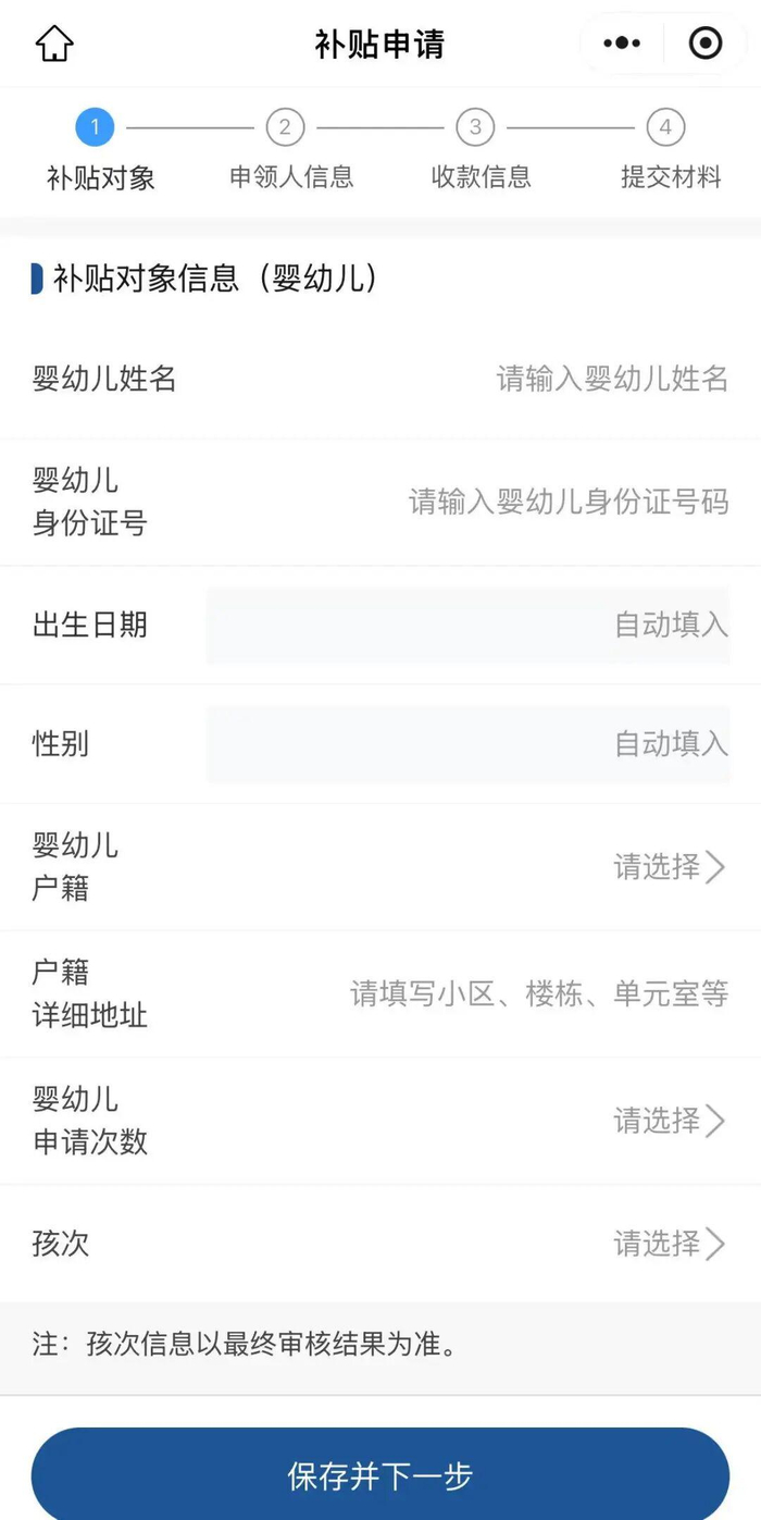 🌟以微信为例,在微信小程序搜索“育儿补贴”,在小程序首页输入婴幼儿户籍所在省份,点击“立即前往”,即可跳转至官方政务服务平台,按页面提示填写相关资料并提交申请领取育儿补贴。