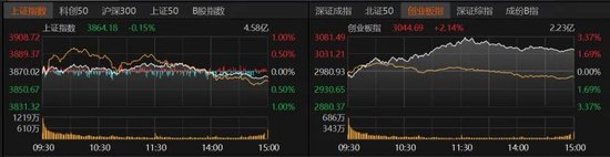 沪深两市走势分化。沪指午后走低,最后收跌0.15%报3864.18点;创业板指午后进一步走强,收涨2.14%报3044.69点。深证成指涨逾1%。科创50、沪深300、上证50涨幅均不超过1%,北证50收跌。
