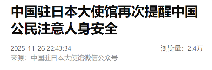 中国驻日本大使馆11月26日发文,再次提醒中国公民注意人身安全。