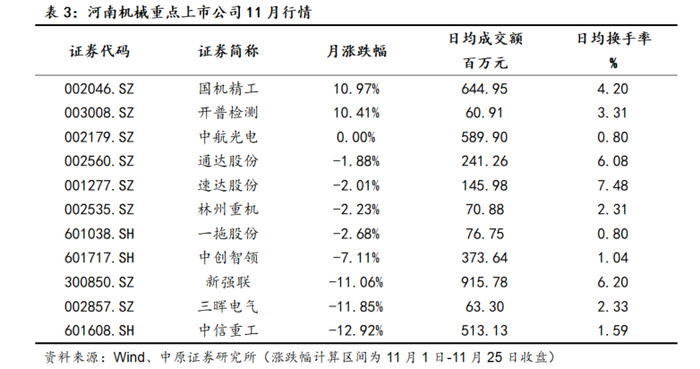11月市场出现了明显的调整,本月船舶、高空作业车等前期弱势板块相对表现良好,固态电池设备、人形机器人、AIDC配套设备等强势板块明显回调。我们建议配置内需为主,基本面向好,盈利稳定,分红和股息率较高的工程机械、高铁设备、矿山冶金设备龙头。市场情绪较好风险偏好有明显提升,利好科创成长板块投资。调整的人形机器人、AIDC配套设备、半导体设备等主题后续仍有机会,建议继续保持关注。