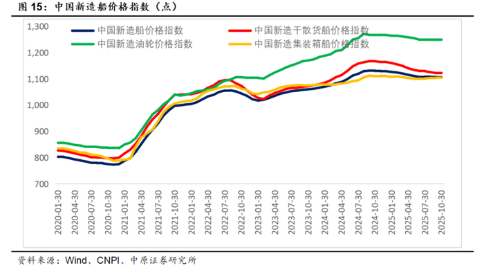 2025年10月底中国新造船价格指数为1106点,环比持平。其中,中国新造干散货船价格指数1140,中国新造油轮价格指数1258,中国新增集装箱船价格指数为1103,环比分别下跌0、0、1个点。新造船价格指数高位下跌企稳。