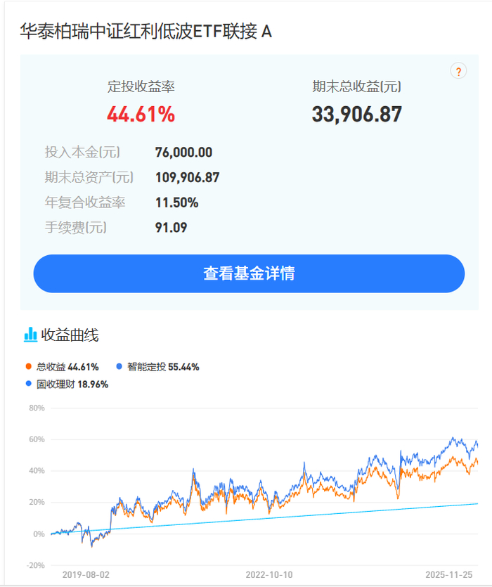 这里的测算周期是2019年8月1日起,每个月1日定投1000元,截至2025年11月25日,期间红利再投资,累计投入本金7.6万元,期末总资产10.99万,年复合收益率为11.5%。