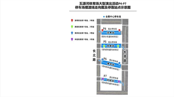 同时,开通星茂购物中心至五源河体育场公交站,P4、P5停车场至五源河体育场A入口,P6、P7停车场至五源河体育场A入口等3条免费公交摆渡线,投放22辆公交车,直达五源河体育场,观演群众可就近停车,摆渡前往。