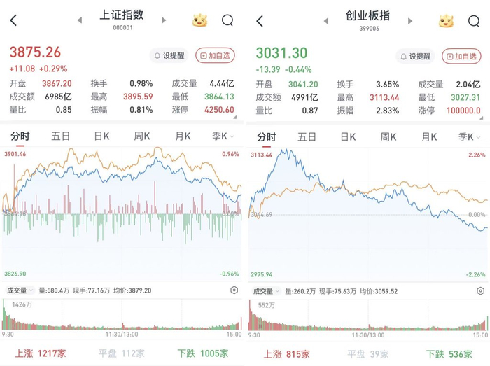 至收盘,上证综指涨0.29%,报3875.26点;科创50指数跌0.33%,报1310.7点;深证成指跌0.25%,报12875.19点;创业板指跌0.44%,报3031.3点。