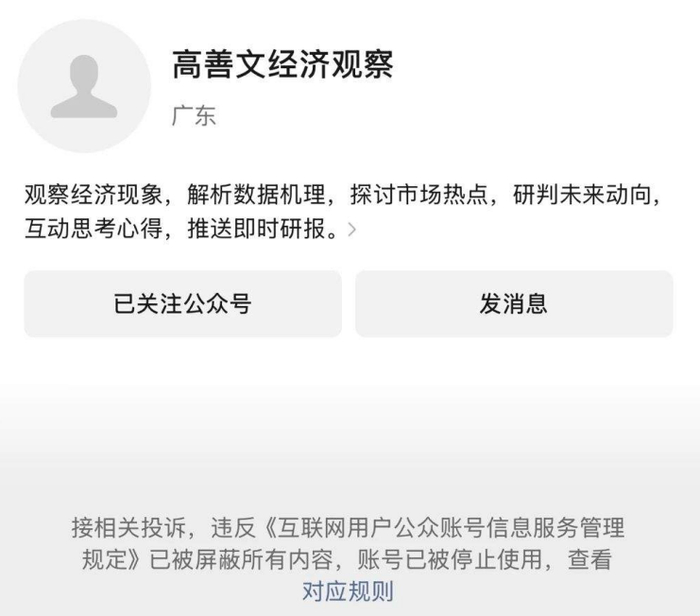 2024年12月,在深圳的一场投资者会议上,高善文以及时任东北证券(000686.SZ)首席经济学家付鹏,因发表了不当言论,社交媒体账号均被封禁。
