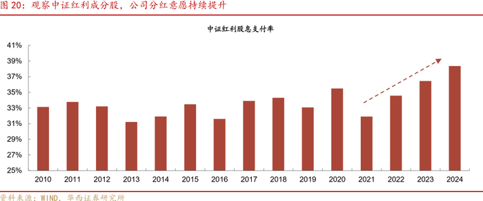 值得注意的是,股息率(通过近12个月现金分红计算)在今年7月以来明显下降,或许并非红利逻辑受到冲击的证据。将股息率拆分为股息支付率/市盈率来看,股息支付率可能因大量公司派息尚未落地而大幅下降(这也是其每年7月大幅下降的原因)。不过,从年底数据来看,中证红利股息支付率在2021年以来持续回升,而在“新国九条”对上市公司分红的指导延续的情况下,股息支付率或许不会成为红利逻辑的隐患。同时,市盈率随权益行情上升,对股息率形成一定压力,但这并不构成红利逻辑的潜在压力,因为股价上涨能够帮助投资者获得资本利得。